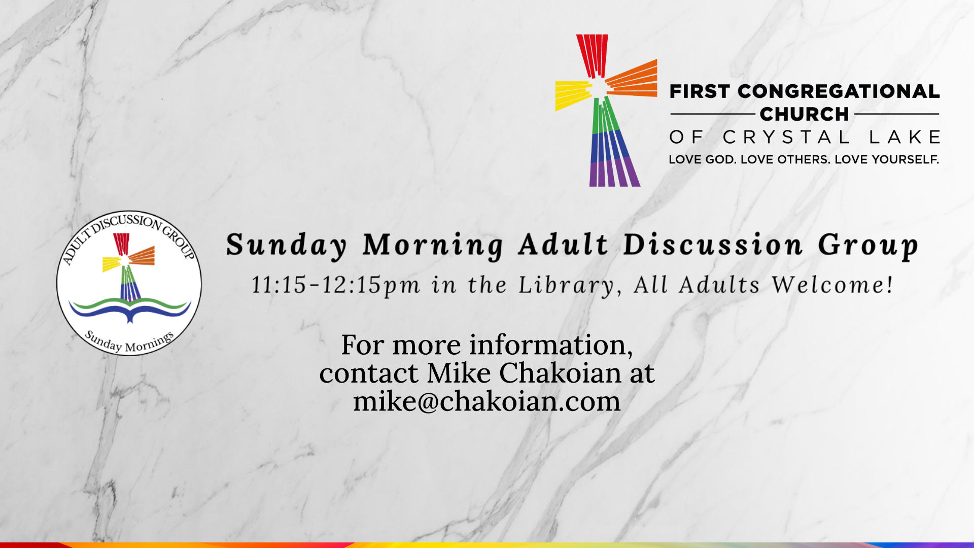 Join us for the Sunday Morning Adult Discussion Group Sundays after Worship at 11:15AM in the Library
