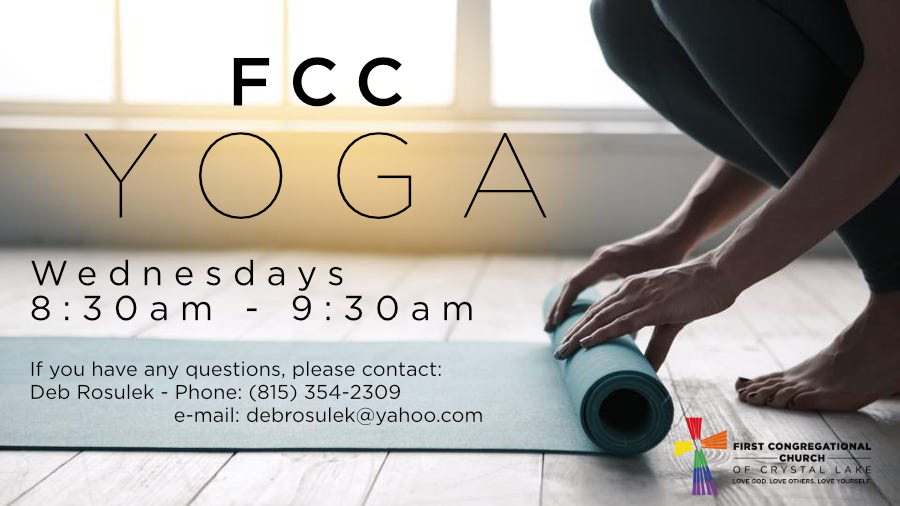 FCC Yoga Wednesdays 8:30AM - 9:30AM If you have any questions, please contact: Deb Rosulek Phone: (815) 354-2309 e-mail: debrosulek@yahoo.com