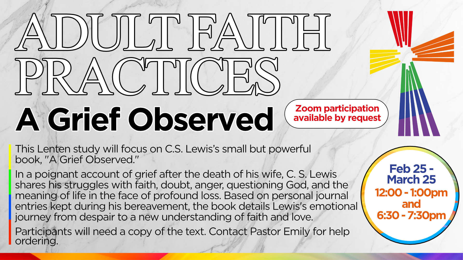 A Grief Observed Hosted by Pastor Emily This Lenten study will focus on C.S. Lewis's small but powerful book, "A Grief Observed." In a poignant account of grief after the death of his wife, C. S. Lewis shares his struggles with faith, doubt, anger, questioning God, and the meaning of life in the face of […]