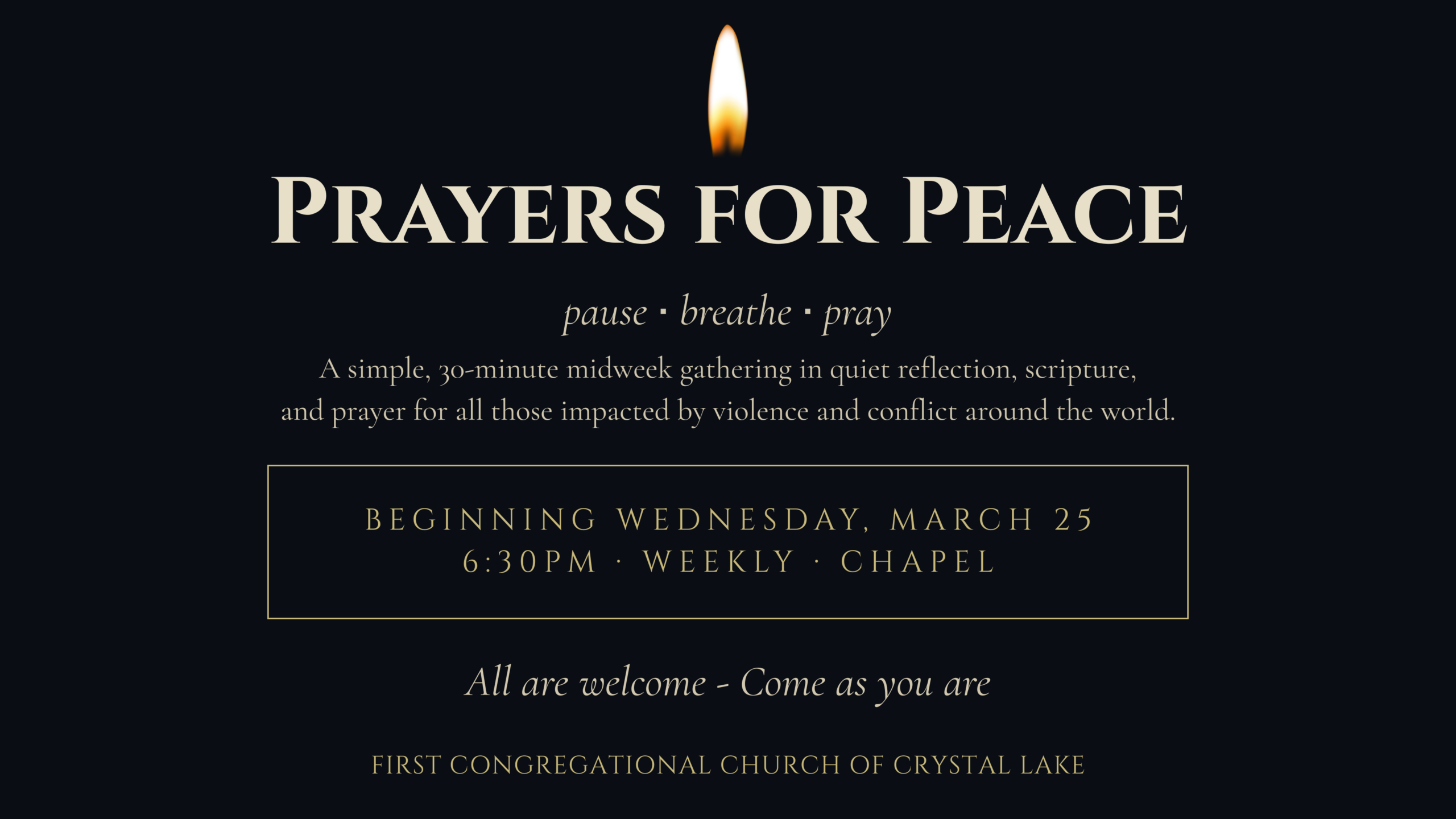 Prayers for Peace Join us Wednesday Evenings A simple, 30-minute midweek gathering in quiet reflection, scripture, and prayer for all those impacted by violence and conflict around the world.