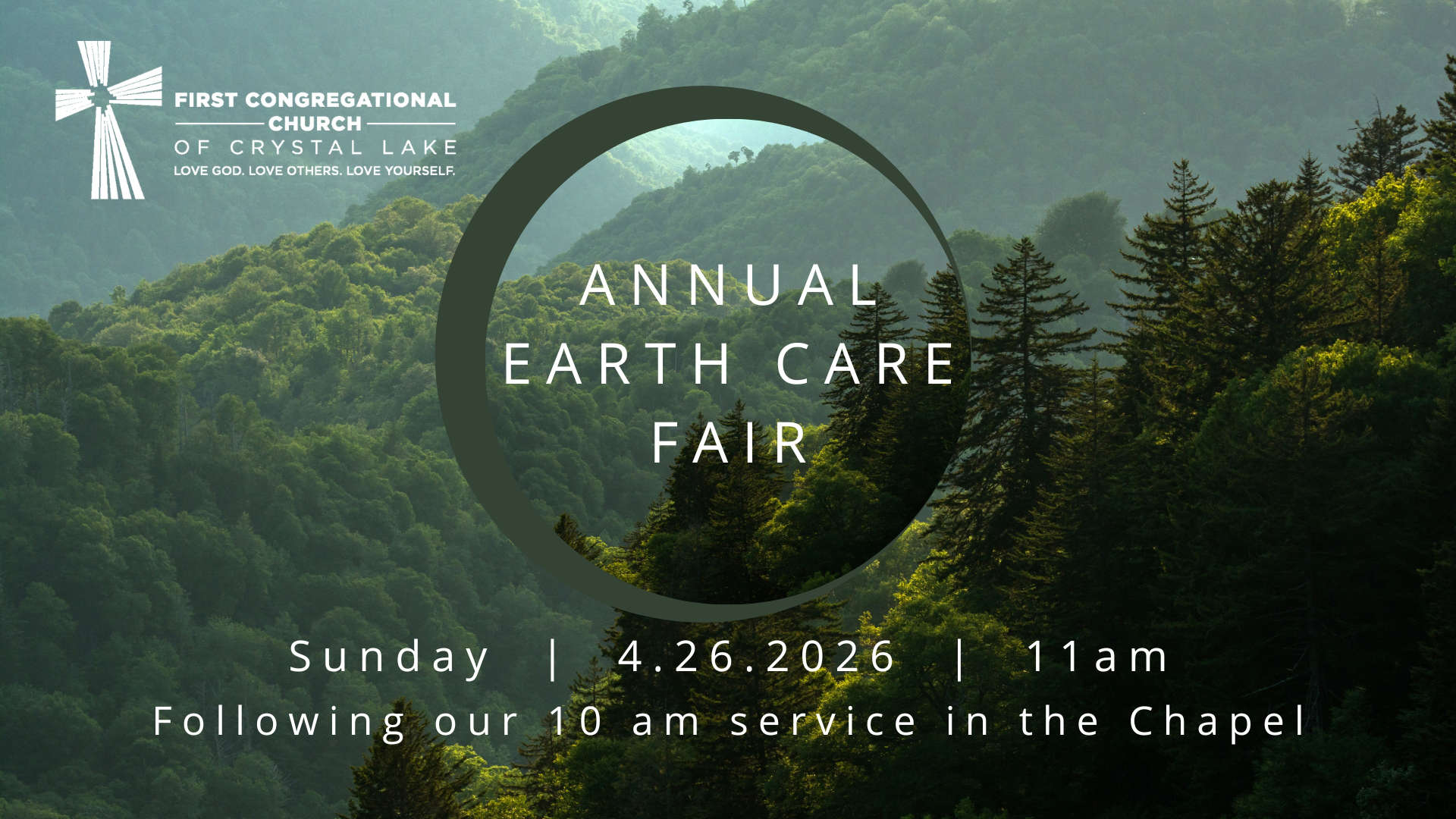 Annual Earth Care Day Looking for ways to improve your sustainability practices at home or work? Join us for this educational event for all ages during our Fellowship time. From Healthy Food to Solar Power, we will have information for you! Location: The Chapel after the 10am Worship Service