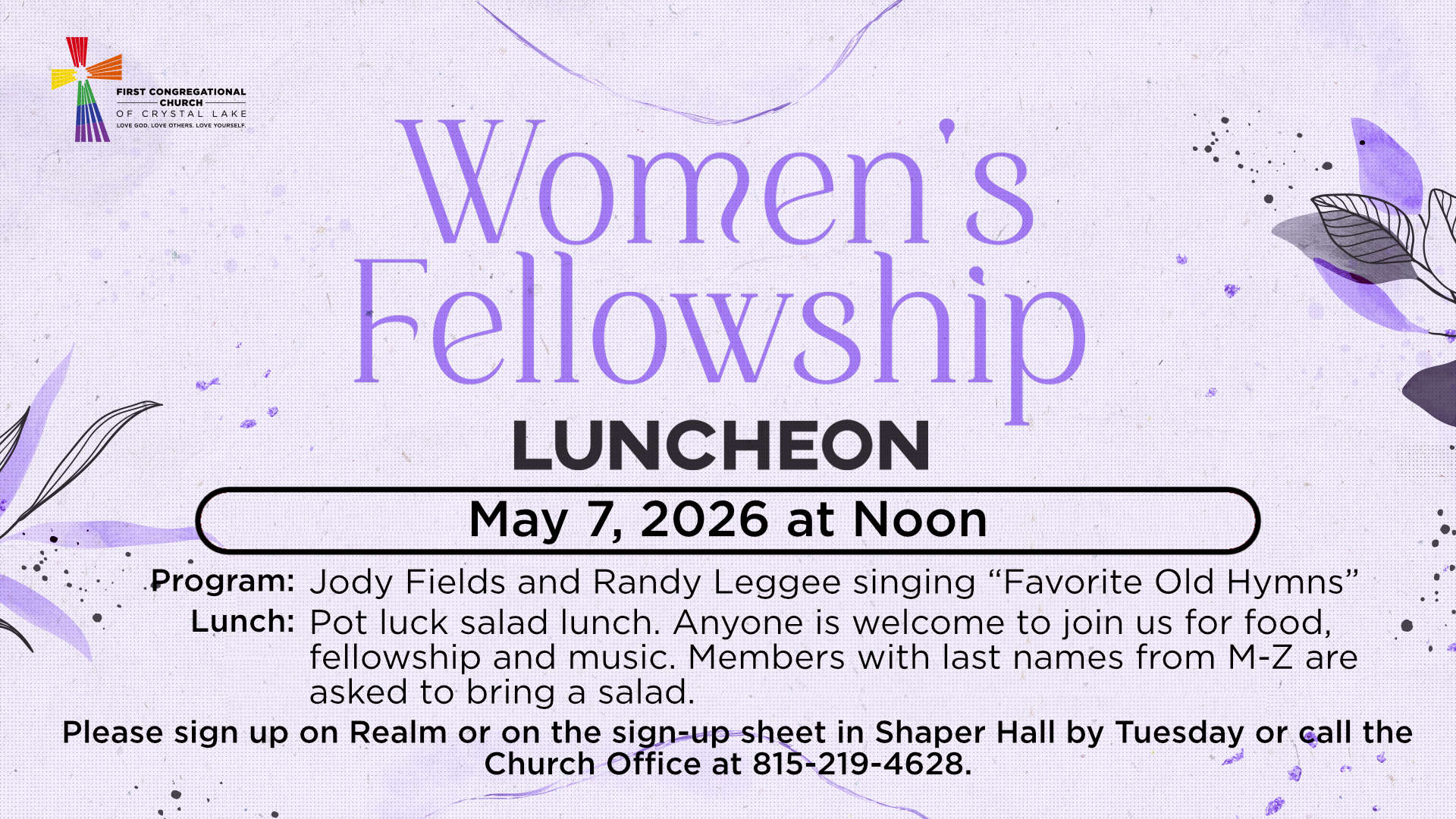 Program: Jody Fields and Randy Leggee singing "Favorite Old Hymns" Lunch: Pot Luck Salad Lunch Anyone is welcome to join us or food, fellowship and music. Members with last names from M-Z are asked to bring a salad. Our gathering will be downstairs in the Children’s Worship Center Please sign up on Realm or on […]